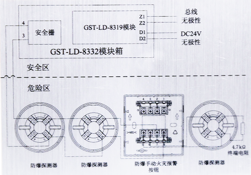 GST-LD-8332編址接口模塊(以下簡稱編址接口模塊)可與防爆設(shè)備(防爆感溫、感煙、煙溫復合探測器、防爆手動報警按鈕等)配接,組成本安型防爆系統(tǒng)。一旦發(fā)生火災,編址接口模塊將報警信號通過總線傳入火災報警控制器(以下簡稱控制器),控制器產(chǎn)生報警信號并顯示出編址接口模塊的報警地址信息。當編址接口模塊本身出現(xiàn)故障時,控制器將產(chǎn)生故障信號并顯示編址接口模塊故障地址信息。
